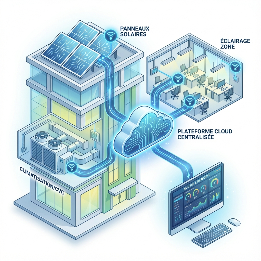 Dans un immeuble tertiaire, le suivi doit distinguer les zones par usage (bureaux, parties communes, parkings) et par type d'équipement (CVC, éclairage, ascenseurs, serveurs informatiques). Cette segmentation permet d'identifier précisément les sources de gaspillage.